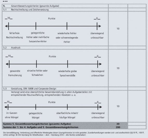 Für „Rechtschreibung, Zeichensetzung, Ausdruck, Gestaltung, DIN 5008 und Corporate Design“ können aufgabenübergreifend maximal 30 von 200 Punkten vergeben werden. Aufgrund von Hinweisen von Korrektoren nach der ersten Teil-1-Prüfung im Oktober 2015 hat sich der zuständige Fachausschuss dazu entschlossen, die 30 Punkte ab der Abschlussprüfung Sommer 2016 wie folgt aufzuteilen: