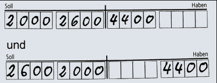 Sofern auf der Soll- und/oder Habenseite mehrere Kontennummern einzutragen sind, spielt die Reihenfolge auf der jeweiligen Seite keine Rolle. Im folgenden Beispiel wäre als Lösung auch “(Soll) 2600 / 2000 an (Haben) 4400” richtig. Die Kontennummer 4400 könnte auf der Habenseite entweder im linken oder im rechten Kästchenblock eingetragen werden.
