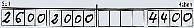 Sofern auf der Soll- und/oder Habenseite mehrere Kontennummern einzutragen sind, spielt die Reihenfolge auf der jeweiligen Seite keine Rolle. Im Beispiel wäre als Lösung auch “(Soll) 2600 / 2000 an (Haben) 4400” richtig. Die Kontennummer 4400 könnte auf der Habenseite entweder im linken oder im rechten Kästchenblock eingetragen werden.